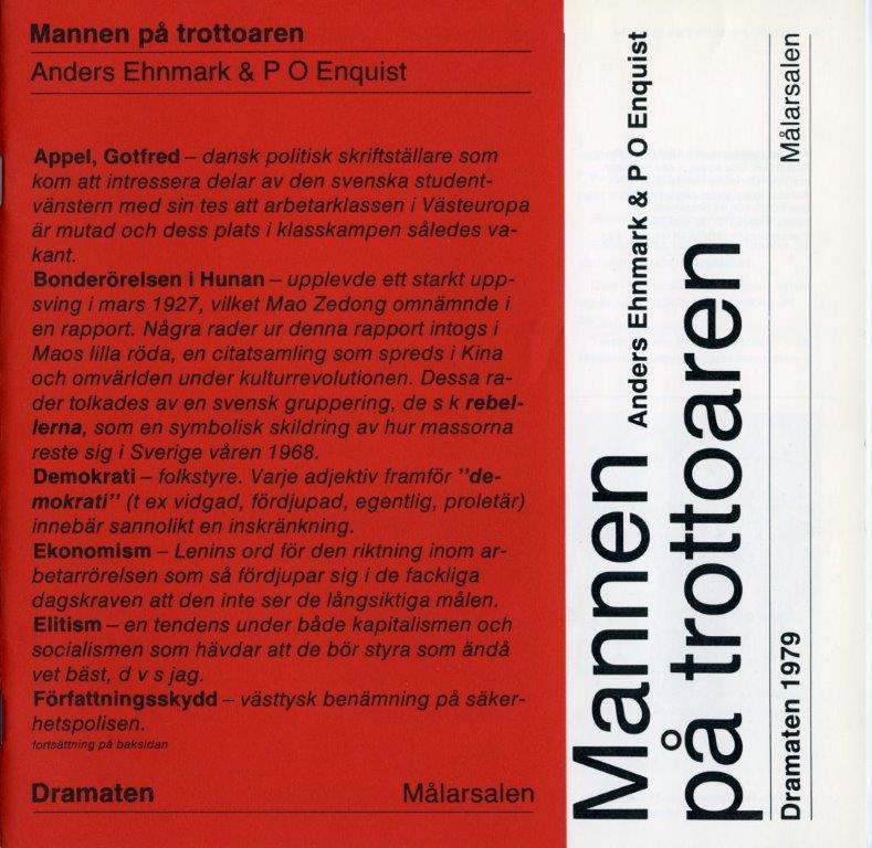 Åter fann man produktionsuppgifter och rollista på mittsidorna, dessutom fanns i programmet föreställningsbilder och ett par tre kortare artiklar – utrymmet var knappt. Här gällde det, som policydokumentet föreskrev, att begränsa sig till ”väsentlig information inför teaterföreställningen”.