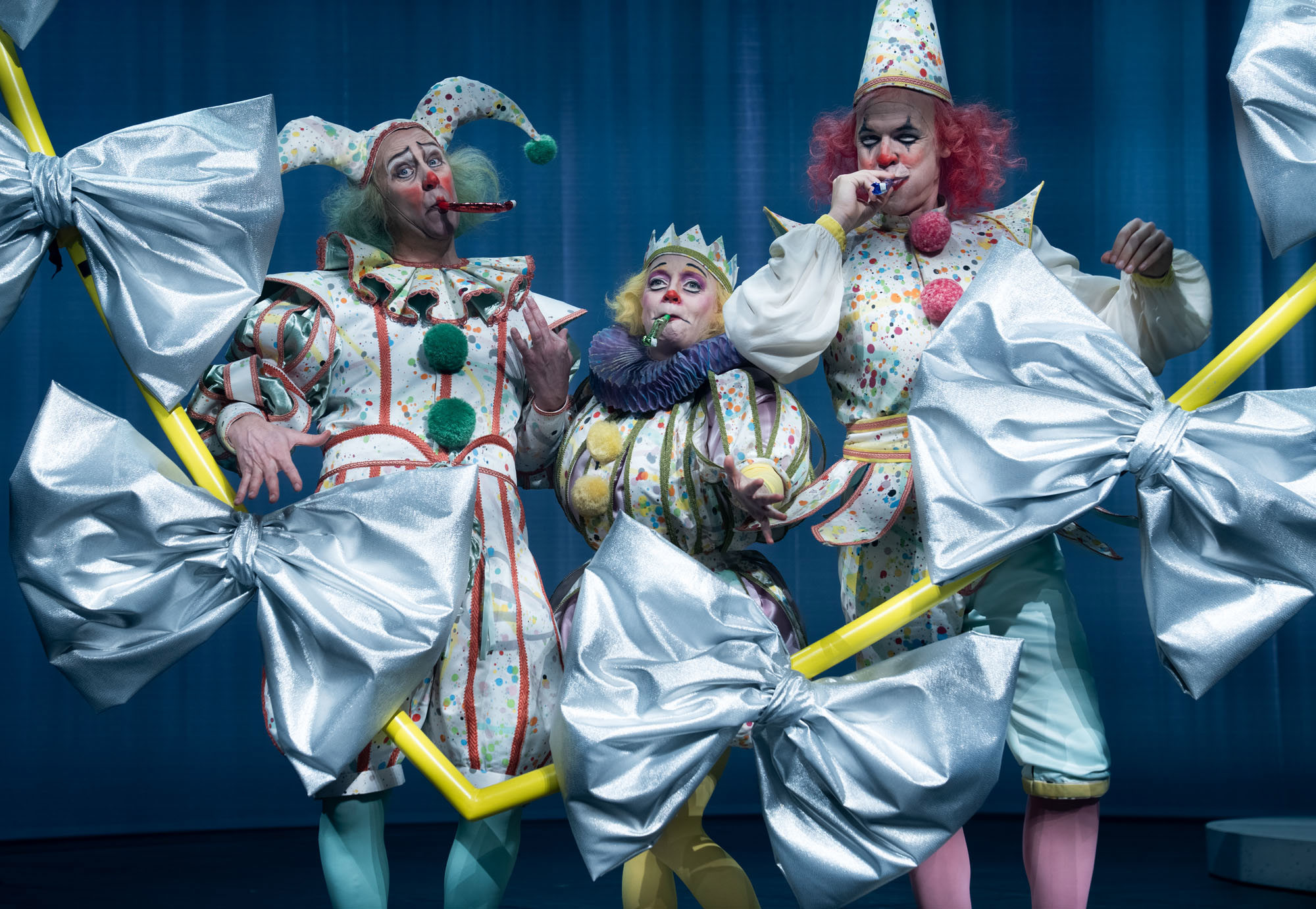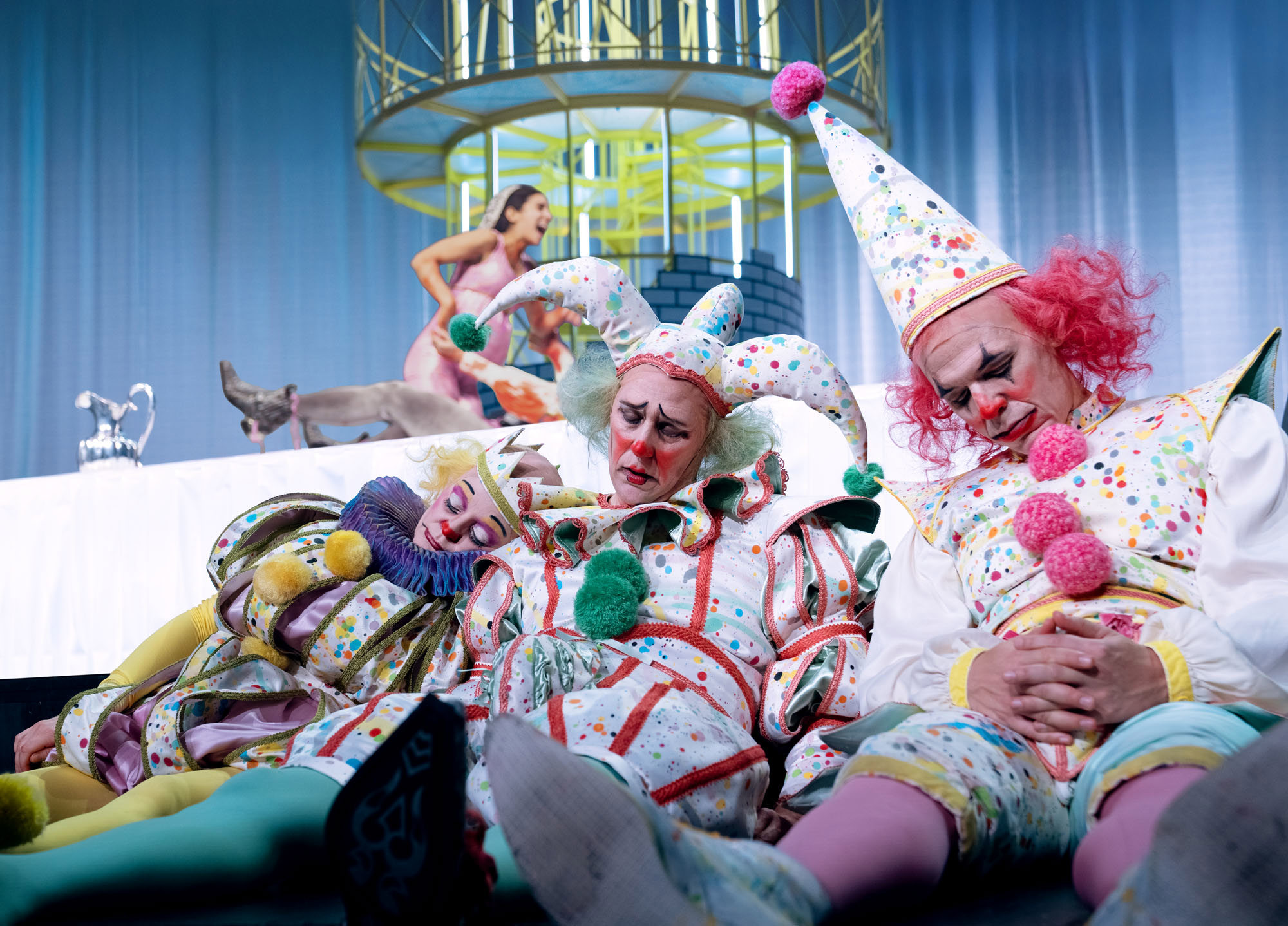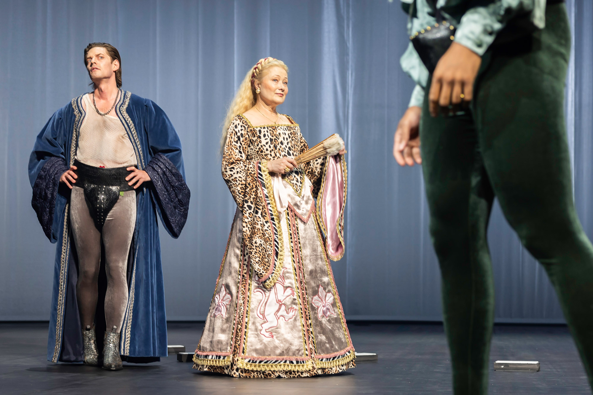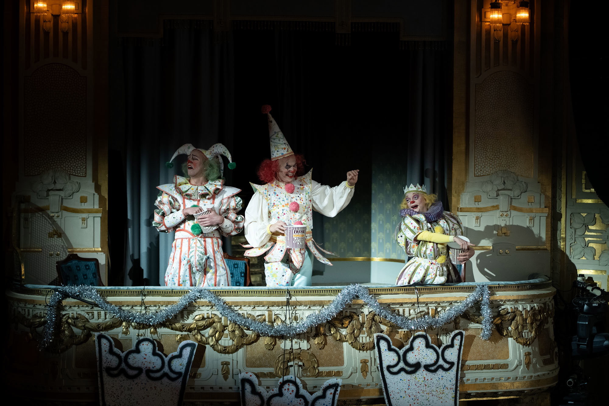 Resultatet? En explosiv, bjussig och maximalistisk föreställning som tar oss till en värld där 1500-tal möter nutid – via 1980-talet. Där clowner rör sig i salongen och reagerar på det som händer på scenen. Och där musiken och 15 dansare från Balettakademin förhöjer stämningen och lockar till fest.